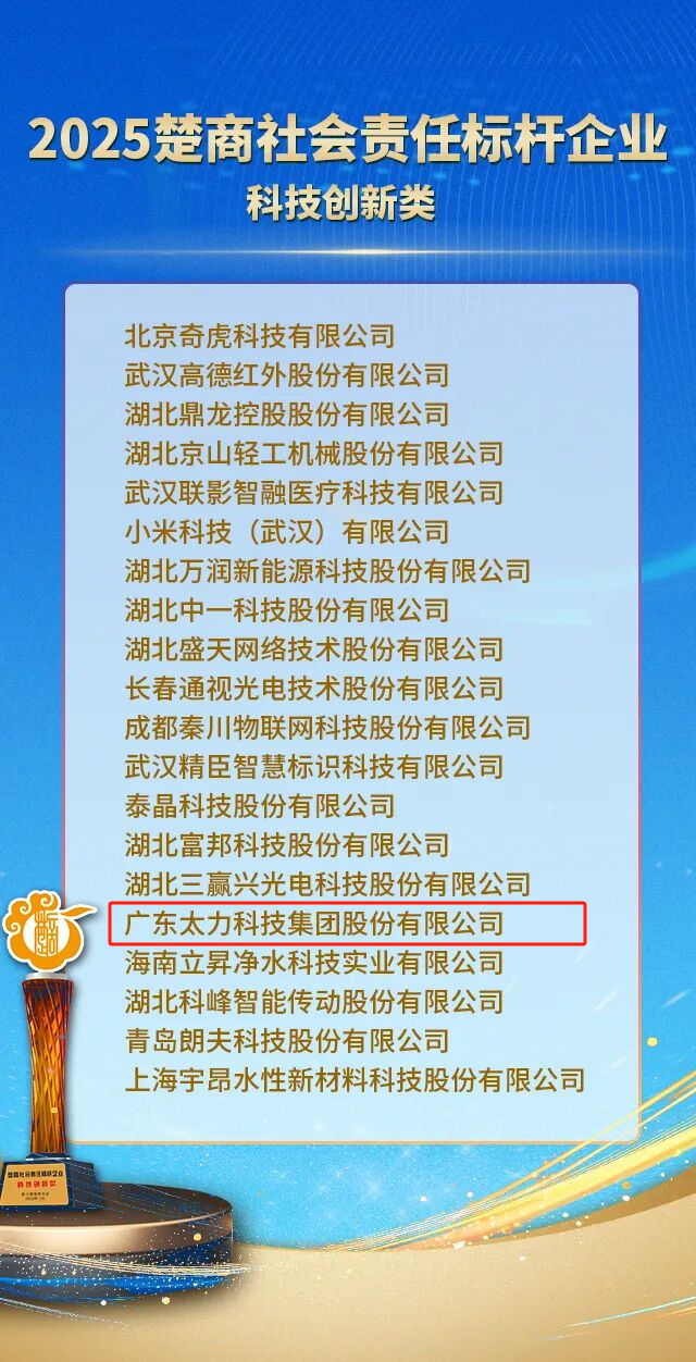 本屆楚商大會為精準表彰在各領(lǐng)域積極踐行社會責任、推動行業(yè)進步的優(yōu)秀企業(yè),特將“楚商社會責任標桿企業(yè)”評選細分為綜合類、科技創(chuàng)新類、綠色發(fā)展類、鄉(xiāng)村振興類和穩(wěn)崗就業(yè)類五大類。每個類別僅有20家企業(yè)能夠脫穎而出,太力科技與小米科技、奇虎科技等企業(yè)共同入選,既是大會對太力創(chuàng)新實力的認可,更是對太力以技術(shù)創(chuàng)新履行社會責任的肯定。